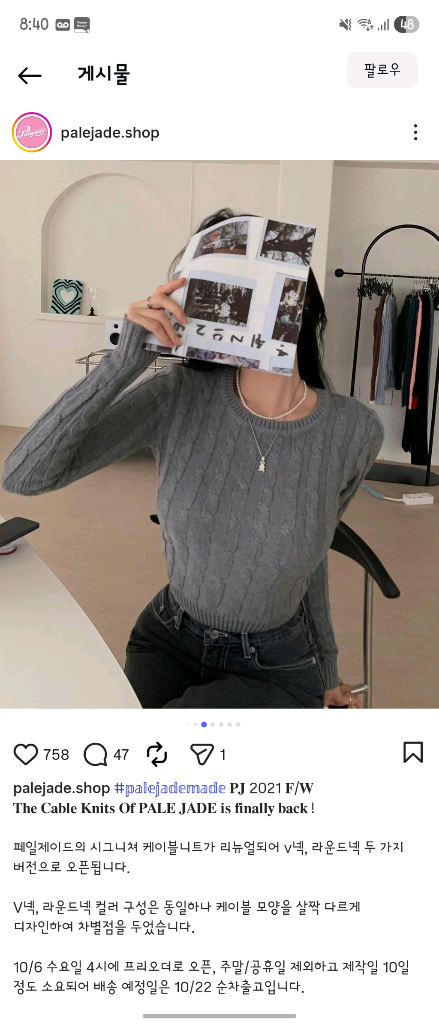 개인정보(거래정보)를 주고받는 행위는 사기에 노출될 수 있으므로 즉시 중고나라로 신고해 주세요케이블 패턴 니트예요. 그레이 컬러로 어떤 옷과도 잘 어울리고 상태도 깔끔합니다. 가을겨울 데일리룩으로 완벽해요!