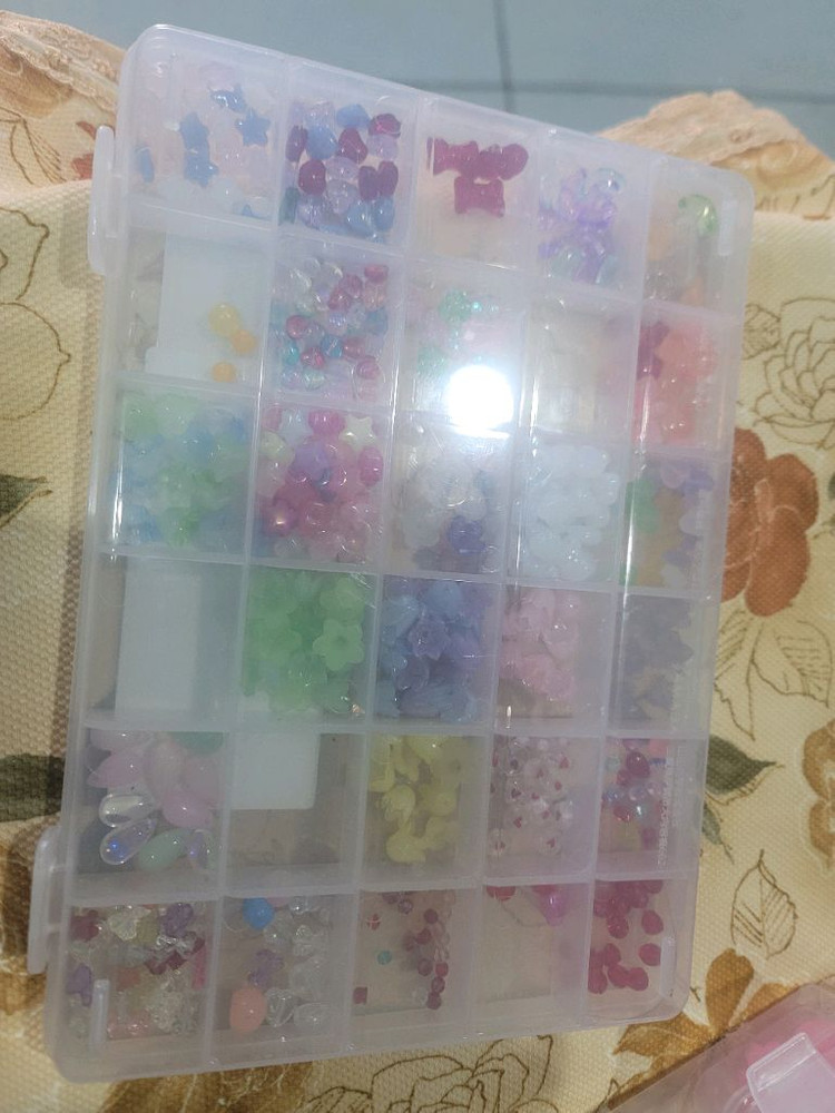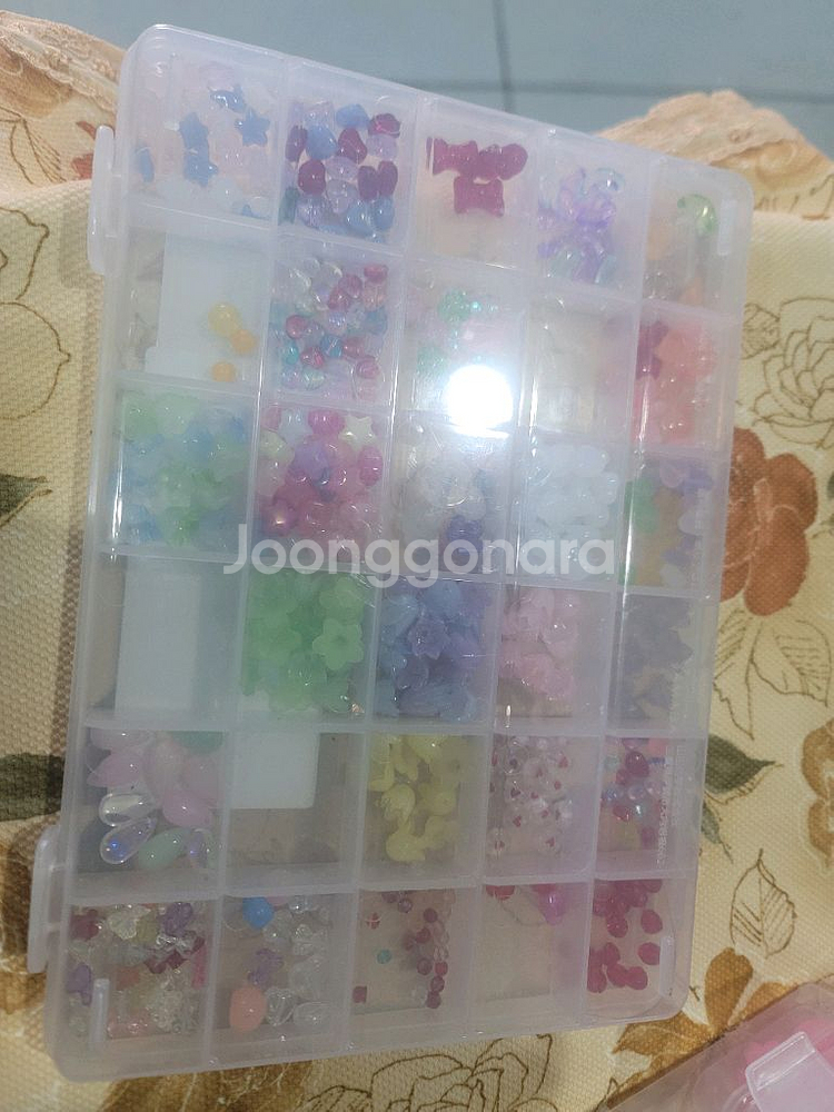 다양한 색상의 네일아트 비즈들이 깔끔하게 정리된 케이스에 들어있어요. 핑크, 퍼플, 그린 등 예쁜 컬러들로 구성되어 있고 상태도 양호합니다. 홈네일이나 DIY 작업할 때 유용해요!