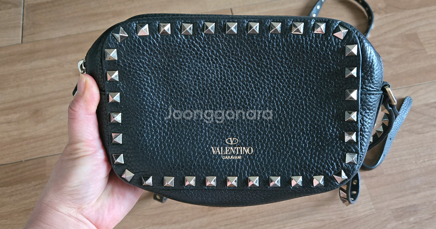 발렌티노 가라바니 락스터드 미니 크로스백입니다 전면에 골드 로고(VALENTINO GARAVANI)와 사각 피라미드 스터드가 테두리로 둘러져 있는 디자인이며 검정 그레인 가죽 소재로 고급스러운 질감이 느껴집니다 사진에서 확인되는 상태는 사용감이 있으나 눈에 띄는 큰 흠집이나 오염은 없고 스터드와 지퍼, 스트랩 모두 양호한 편입니다 - 사이즈(실측 권장) : 미니 사이즈의 숄더/크로스 스타일로 소지품 최소화에 적합 - 소재 특징 : 그레인 가죽으로 생활 스크래치에 강하고 은은한 텍스처가 장점입니다 - 대표 판매 포인트 : 아이코닉한 락스터드 장식과 컴팩트한 미니 사이즈라 데일리 및 포인트 룩에 좋습니다 구매 시 참고하실 수 있도록 사진 그대로 드립니다