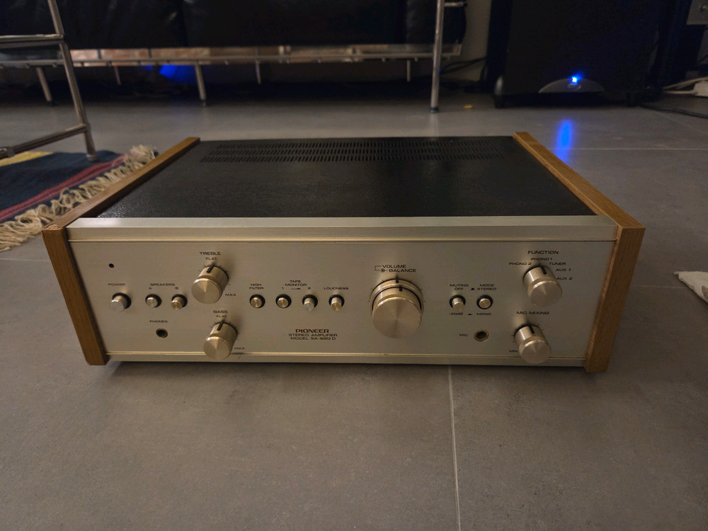 1970년대 중반 오디오 황금기에 출시된 Pioneer(파이오니아) SA-8200 스테레오 인티앰프입니다. 후면에 다양한 연결 포트가 있습니다 모서리 부분에 손상이 있습니다(3번째 사진 참고) 포노 단자가 있어 턴테이블 연결이 용이합니다.