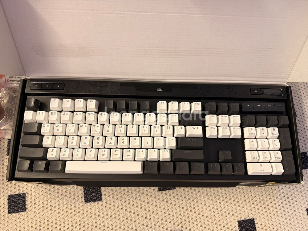 커세어 K70 MAX 공방 풀윤활 키보드 팝니다. 키캡은 블랙/화이트 투톤으로 포인트를 줬습니다. 갤럭시팩토리 에서 32,000 에 제작한 키보드 루프커버도 같이 드립니다. 윤활 as가 2029년 까지라 키보드 청소 및 윤활은 주기적으로 보내주심 됩니다 원래 있던 기본 키캡은 일부 분실되어서 커새어 정품 이중사출 키캡 블랙 베이스에 화이트 추가로 조합한 상태입니다 사진상의 artic white 키캡 + artic 블랙 키캡(케아스 없음) 구성품 같이 드립니다 usb케이블 분실하여 다른 usb케이블로 보내드립니다 1주일 정됴 사용한 제품입니다