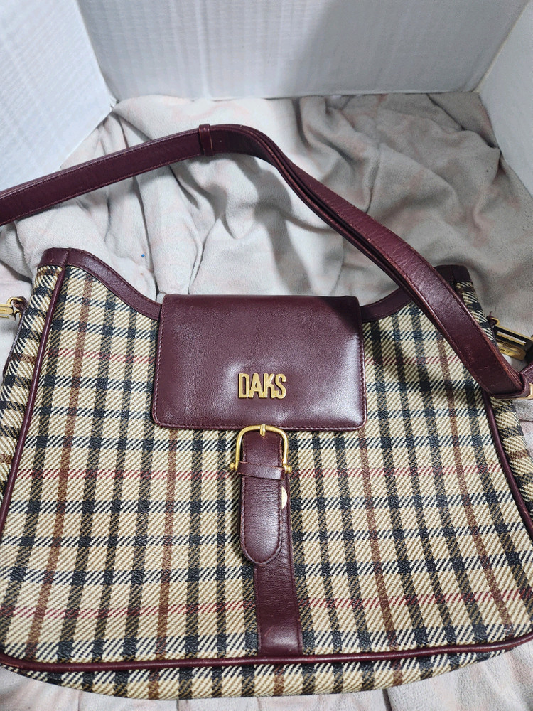 정품 체크 패턴 숄더백이에요. 버건디 가죽 트리밍과 골드 하드웨어가 고급스럽고, 전체적으로 상태 양호합니다. 클래식한 디자인으로 오래 사용하기 좋아요.닥스 가방 입니다