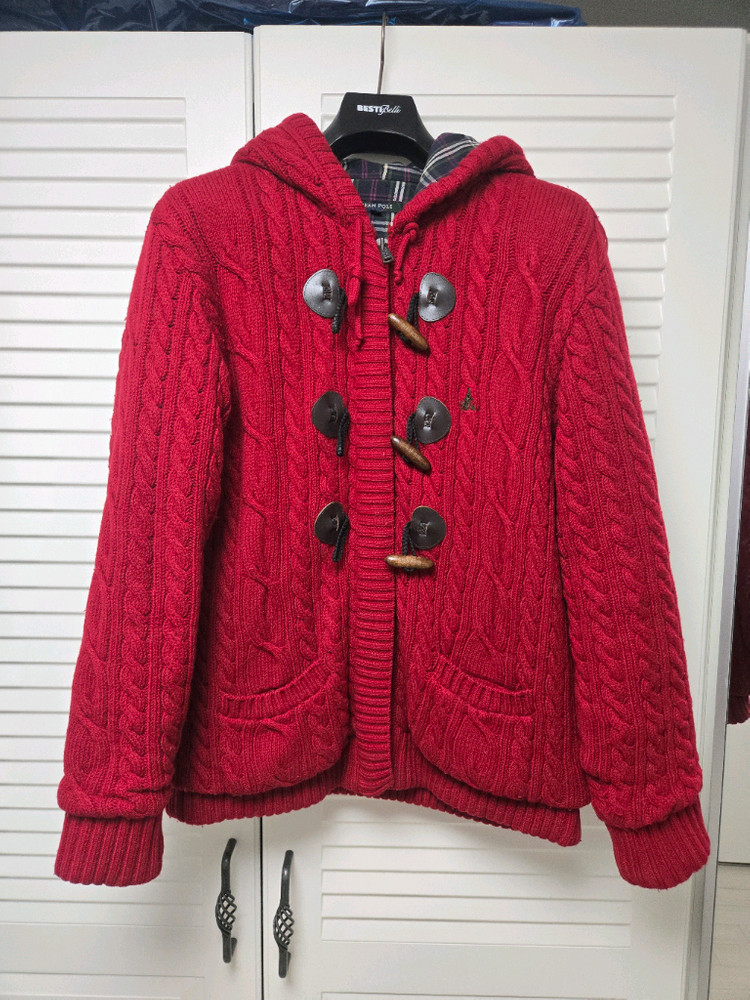 정품 니트 후드 집업이에요. 빨간색 외부와 체크 안감으로 고급스러운 느낌이 물씬 나네요. 상태 양호하고 따뜻하게 입기 좋은 아이템입니다.
