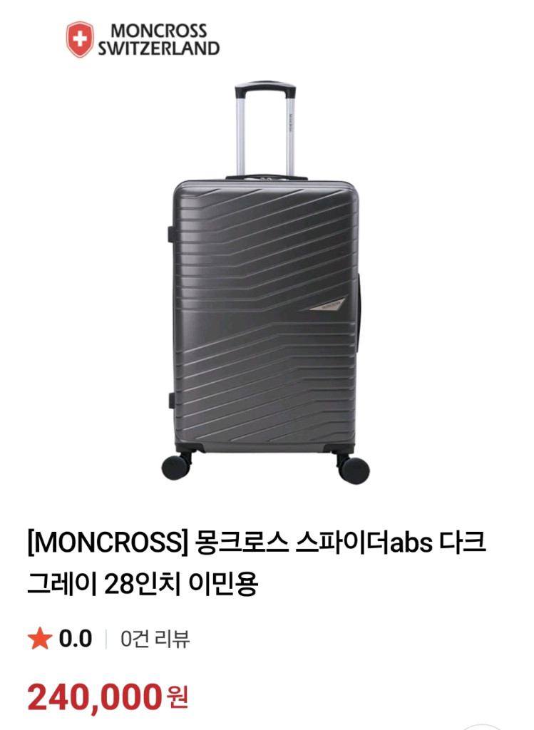 스위스정통브랜드 몽크로스 스파이더 ABS 다크 그레이 28인치 캐리어입니다 새상품이고 비닐도 안 뜯은 상태입니다ㆍ - 튼튼하고 가벼운 ABS 소재로 제작되었습니다 - 부드러운 핸들링이 가능합니다 - 생활 스크래치를 방지합니다