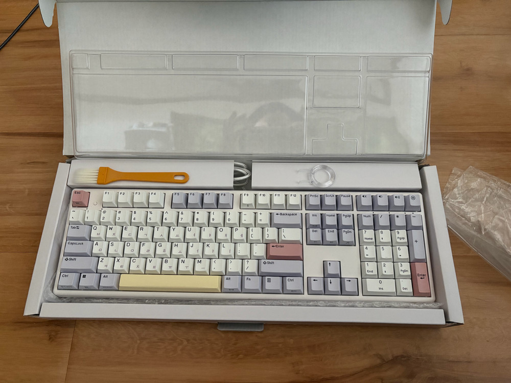 커스텀 기계식 키보드예요. 화이트 베이스에 그레이와 핑크 포인트 컬러가 들어간 깔끔한 디자인이며, 박스와 구성품이 모두 포함되어 있어요. 테스트만 해보고 보관중인 풀박스 제품입니다