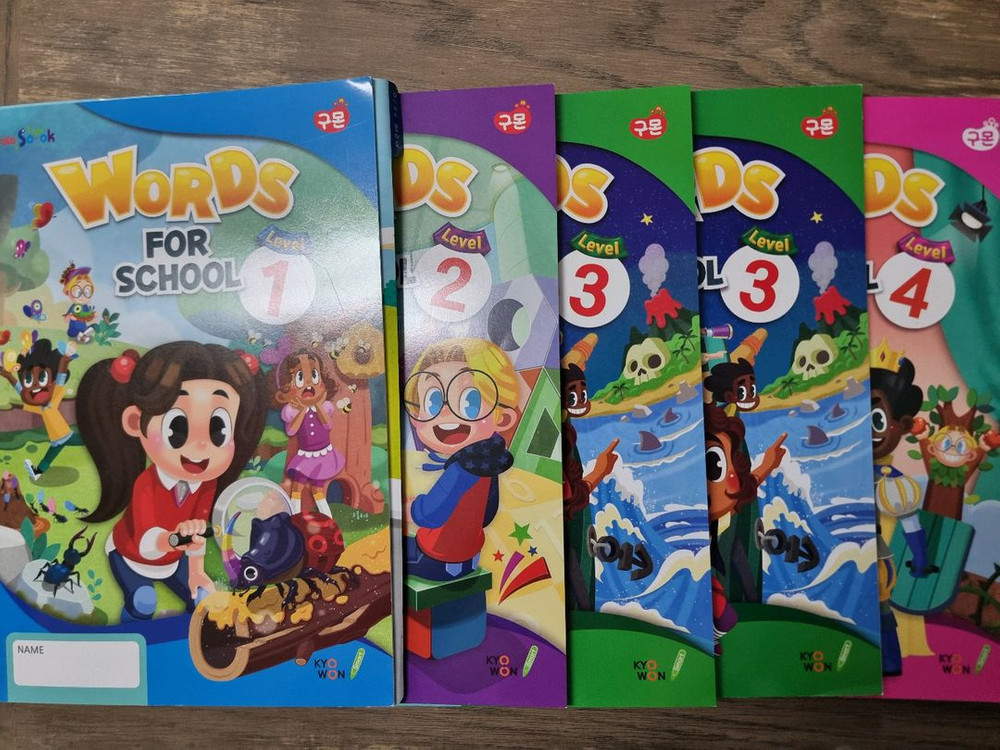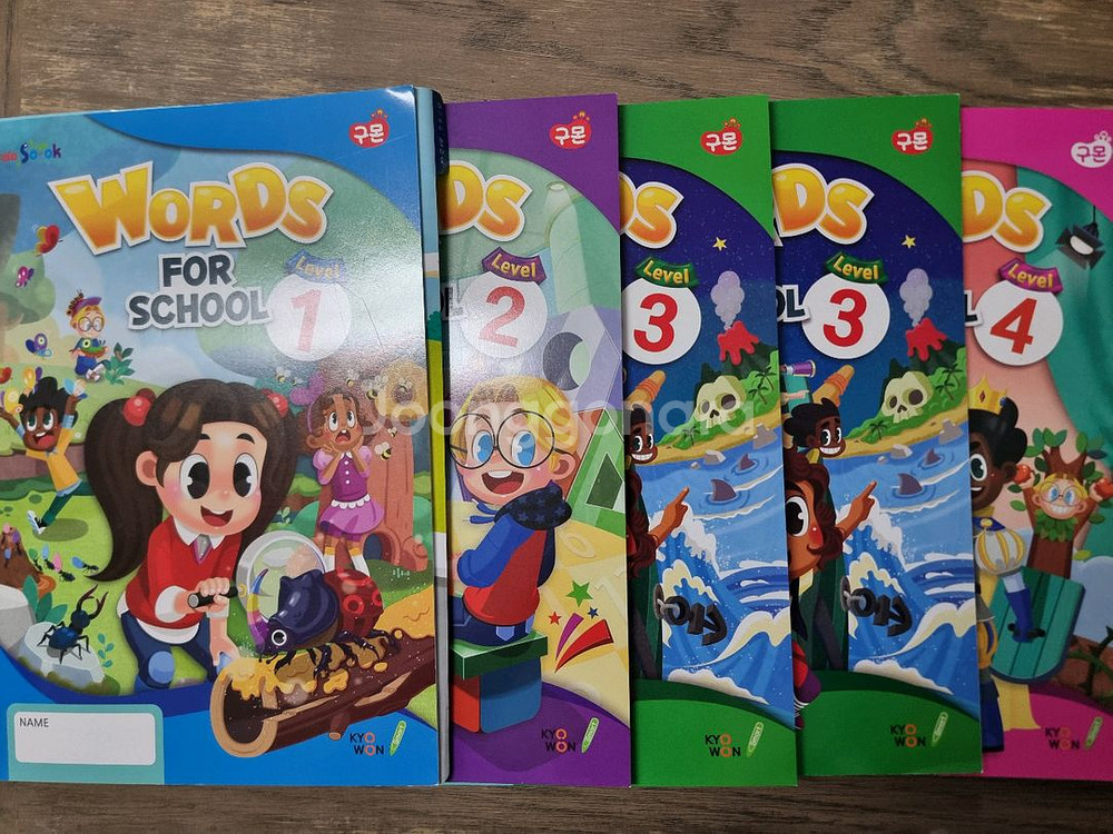 교원 Words for School 영어 교재입니다 레벨 1부터 4까지 있으며, 아이가 낙서한 흔적이 조금 있습니다(사진 참고)