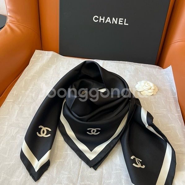 블랙 스카프로 화이트 CC로고와 V패턴이 포인트예요. 박스 포함 새상품 상태로 깔끔하게 보관되어 있어요.