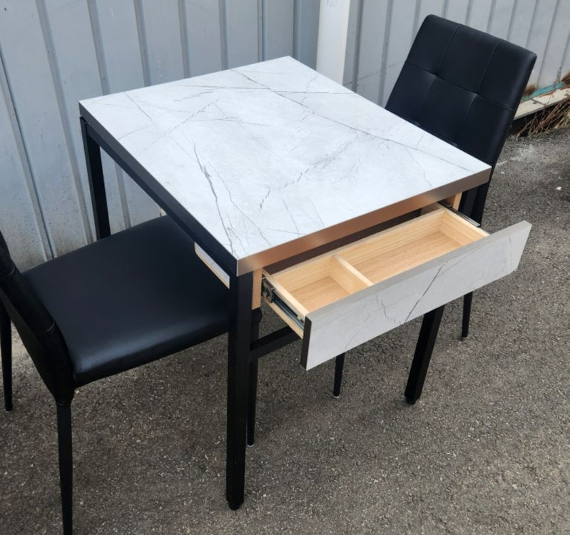 2인용 수저통 있는 식당 테이블입니다 사용기간 3개월로 짧고, 기스방지 시트지 사용했습니다 테이블 테두리 알루미늄 찍힘방지 마감 되어 있어요 총 14개 있습니다 테이블 사이즈 700*600*720mm 개당5만원 직접오셔서 보고구매가능 용달배송가능 (구매자부담)