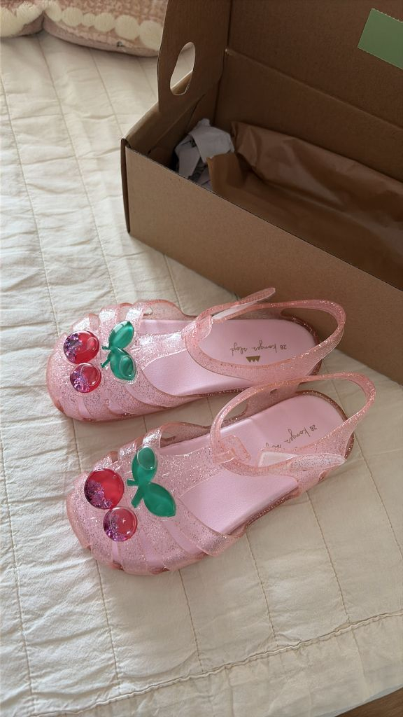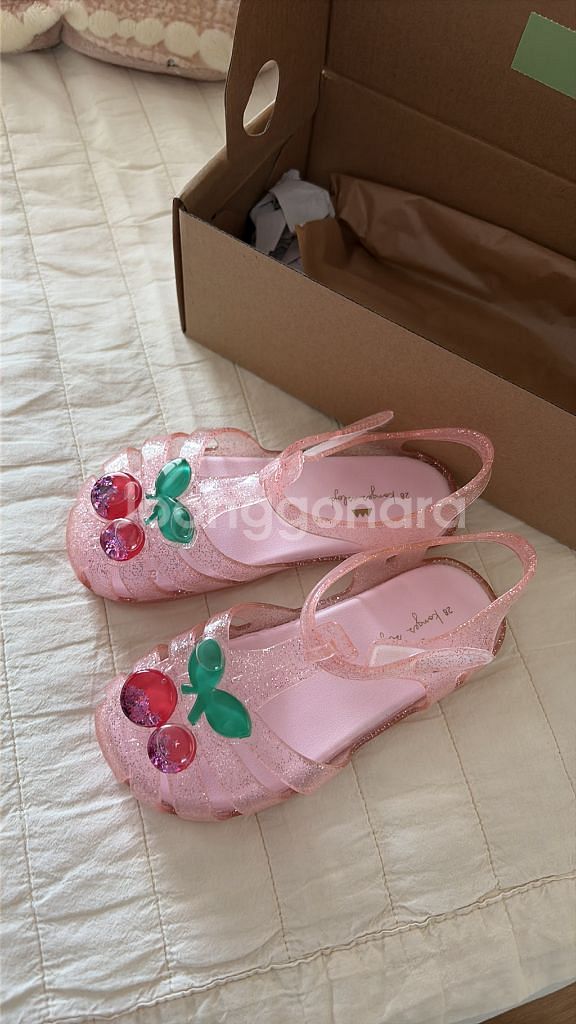 디자인만으로도 공주들 취향인데 움직일때 체리 안에 반짝이들이 움직여서 아이가 더 좋아합니다^^ 올 여름에 신기려고 샀는데 사이즈가 너무 크네요ㅠㅠ 사이즈 체크만 해본 완전 새상품이에요!! 택포입니다