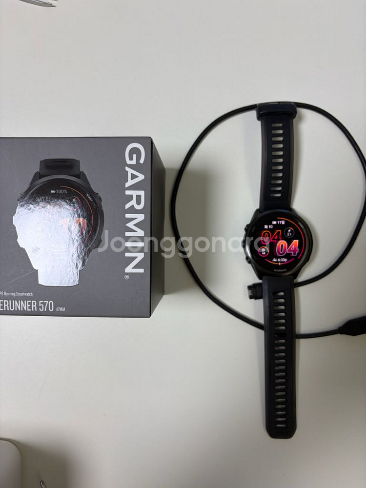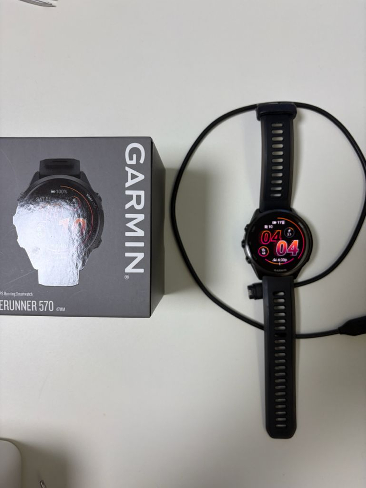 가민 포러너 570 47mm 블랙 풀박스 사진처럼 베젤에 미세한 찍힘 있습니다. 전면부 약간의 생활기스 있습니다. 누구나 실생활로 생기는 정도이고 트집잡기식 네고 요청 안 받습니다. 사진으로 연락처 보내거나 외부거래 유도 사기는 바로 신고합니다. 보증만료 2026-11-01