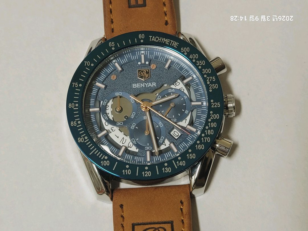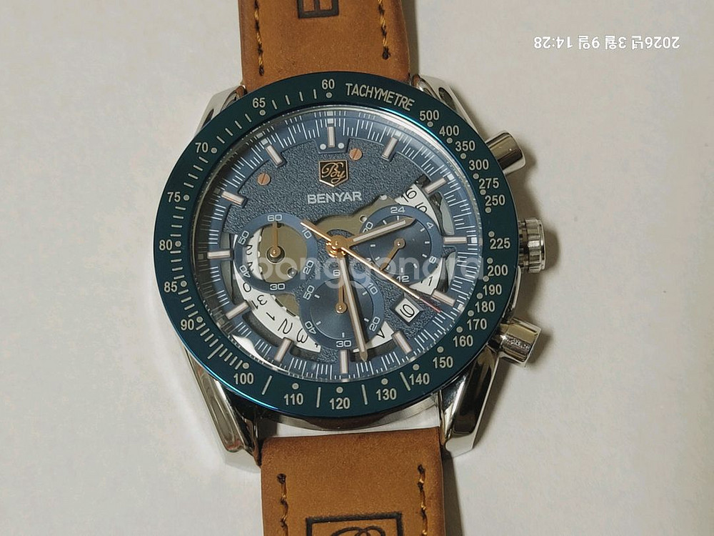 - 크로노그래프 시계예요. - 블루 다이얼에 스테인리스 스틸 케이스와 가죽 스트랩으로 고급스러운 느낌이 물씬 나는 제품입니다. - 30M 방수 기능이 있어 생활 방수가 가능합니다 - 상태 양호하고 이상없이 작동 잘 되는 좋은 시계입니다