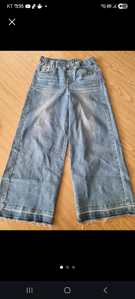 여아용 와이드핏 데님 바지예요. 밑단 프린지 디테일과 편안한 핏으로 트렌디한 스타일링이 가능해요. 상태 양호하고 깔끔하게 관리된 제품입니다.