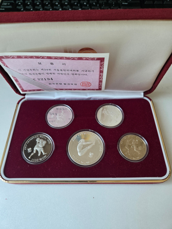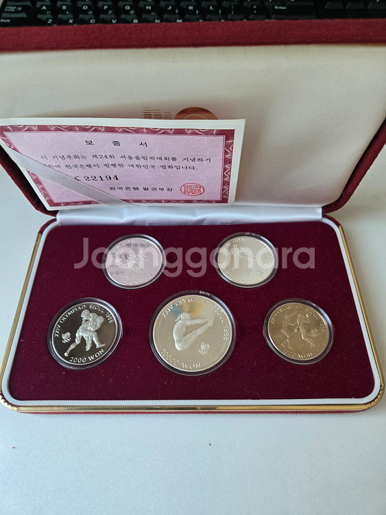 1. 올림픽 기념 동전 5개가 들어있는 세트 프루프 (위 그림 명세서 참고) * 10,000원 은화 1종 - 지름 40mm, 무게 33.62g, 은함량 92.5% * 5,000원 은화 2종 - 지름 32mm, 무게 16.81g, 은함량 92.5% * 2,000원 순니켈 * 1,000원 구리, 니켈 2. 전용 케이스와 함께 보관 중으로 상태 양호 3. 소장용으로 좋음