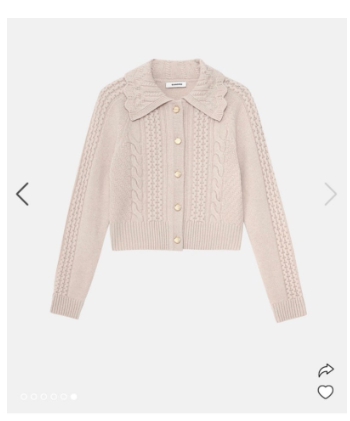 산드로 sandro 스캘럽 카라 니트 가디건 43 사이즈 정품 사이즈 43 총장 45 가슴반품 41.5 정가 599000원입니다 산드로 sandro 베이지 컬러의 고급스러운 가디건입니다 사이즈 43호이고 살짝 도톰한 울 100% 니트 가디건 소재로 봄가을 겨울에 입기 괜찮아요 신축성 있는 소재이고 스캘럽 카라 , 단추 여밈, 소매끝과 밑단 시보리, 케이블 짜임 디테일 있어요 기장감 길지 않아 스커트에도 잘 어울리고 원피스에 레이어드해서 입으셔도 예쁘실것 같아요 예민하신 분 연락 사양하며 사진 그대로 상태로 컨디션 좋아요