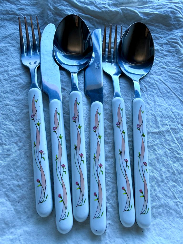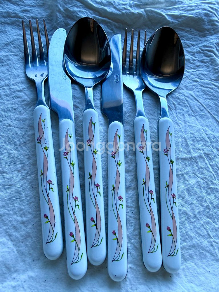 영국 브랜드 Johnson Brothers(존슨 브라더스) 대표 패턴 Eternal Beau (이터널 뷰) 디자인 커트러리입니다. 화이트 세라믹 손잡이에 분홍 꽃과 리본 덩굴 패턴이 들어간 빈티지 감성의 클래식 디자인입니다 🌿 이터널 뷰 식기 시리즈와 함께 사용하면 세트 느낌으로 정말 예쁩니다. ✔ 구성 : 포크 / 나이프 / 스푼 세트 ✔ 총 2세트 일괄 판매 ✔ 길이 약 19cm 빈티지 제품이라 스테인리스 부분에 세월감 및 사용감 있습니다. (예민하신 분은 구매 피해주세요) 카페 감성 식기나 빈티지 테이블웨어 좋아하시는 분께 추천드립니다.