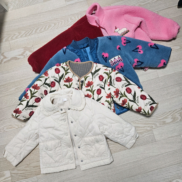 리미떼 1. 빨핑후리스 블루체리후리스 완료 3. 꽃리버서블 M 4. 노랑파랑리버서블 S M 5. 딸기민트 L 완료 6. 파랑집업 S M 장당9천원 로엠걸즈 1. 러플베이지 경량 120 장당2.5만원