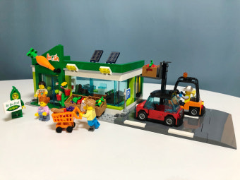 블록 캐주얼 마켓 세트로 미니피규어들과 함께 구성되어 있어요. 상태 양호하고 바로 조립해서 놀 수 있습니다. 아이들이 좋아할 만한 귀여운 마켓 장난감이에요!