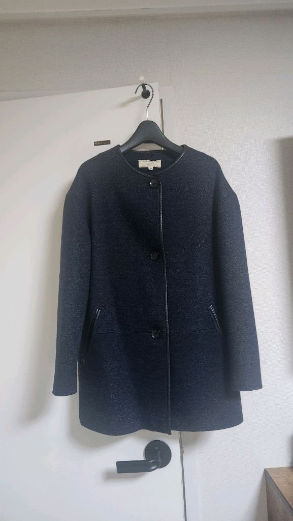 확대아떼 바네사브루노 간절기 아우터예요. 컬러는 네이비 바탕에 목과 호주머니, 앞부분에 인조 가죽 트리밍 되어 있어서 세련된 디자인이예요. 모 함량이 68 퍼센트에 안감도 있어서 따뜻한 편이예요. 연식은 있지만 몇번 입지 않아서 상태는 깨끗하고 좋아요. *드라이 완료*