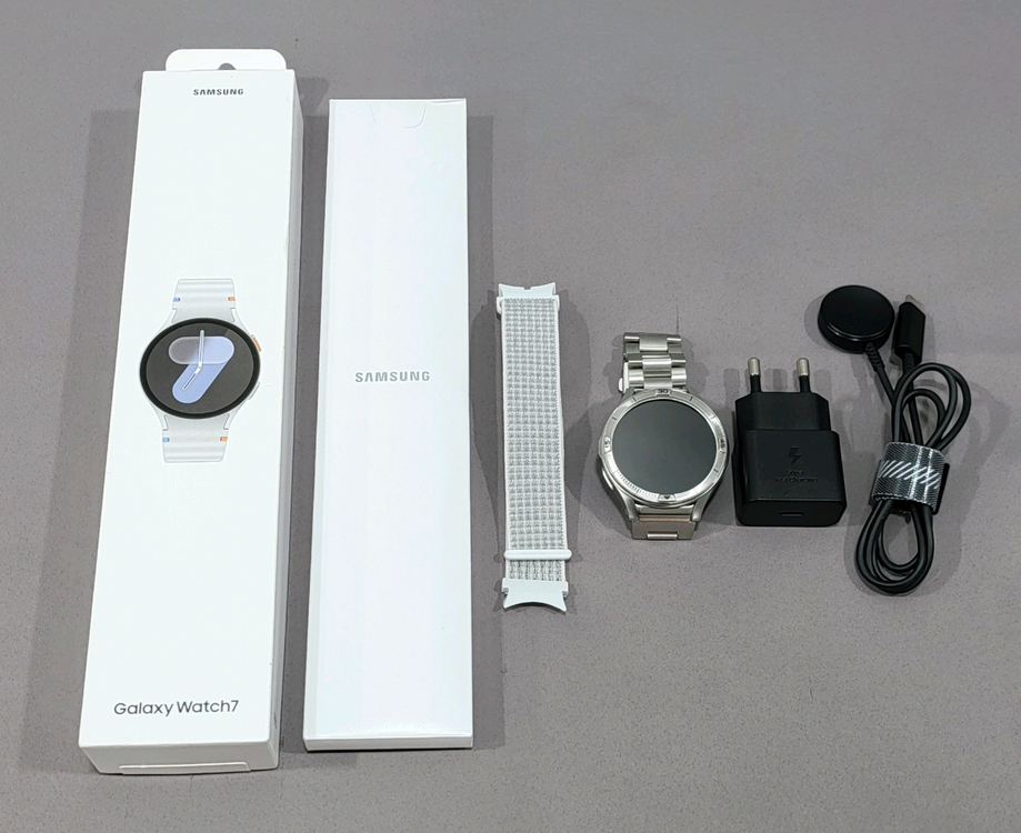 [ 갤럭시 워치7 44mm 32GB (자가유통용) ] 슈피겐 베젤링, 베젤케이스, 금속스트랩(시계줄) 교체하였습니다. 충전기, 충전독, 여분 스트랩, 박스 일체 (사진 참조) 배터리 상태 : 전형적(typical)으로 정상 용량 확인 됩니다. 생산월 : 2025년 3월 ** 외관은 전반적으로 깨끗하며, 배터리 상태 좋습니다.