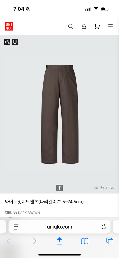 유니클로 와이드핏치노팬츠 다크브라운 73 택없는 새상품 색감 고급지게 잘 나왔어요 르메르맛 추천!