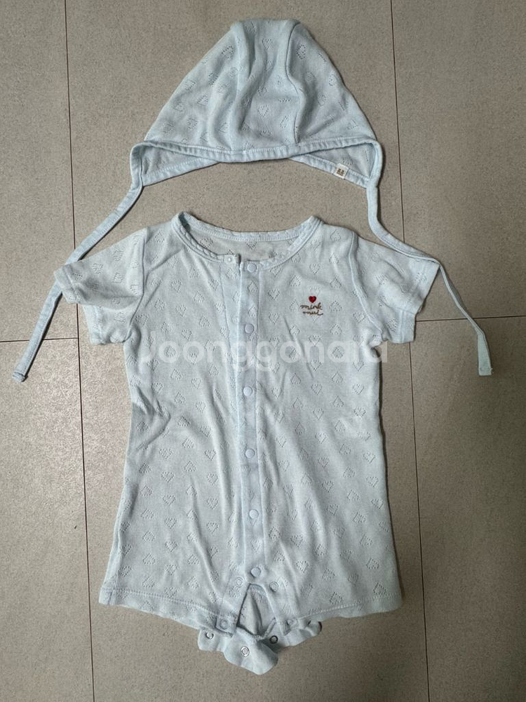 밍크뮤 바디슈트 및 모자 세트 12M입니다. 모달 함유로 촉감 부드러워요. 두번정도 입혀서 사용감 거의 없고 이염없이 상태 좋습니다. 반값택포입니다 거래 후 환불이나 반품은 불가합니다.