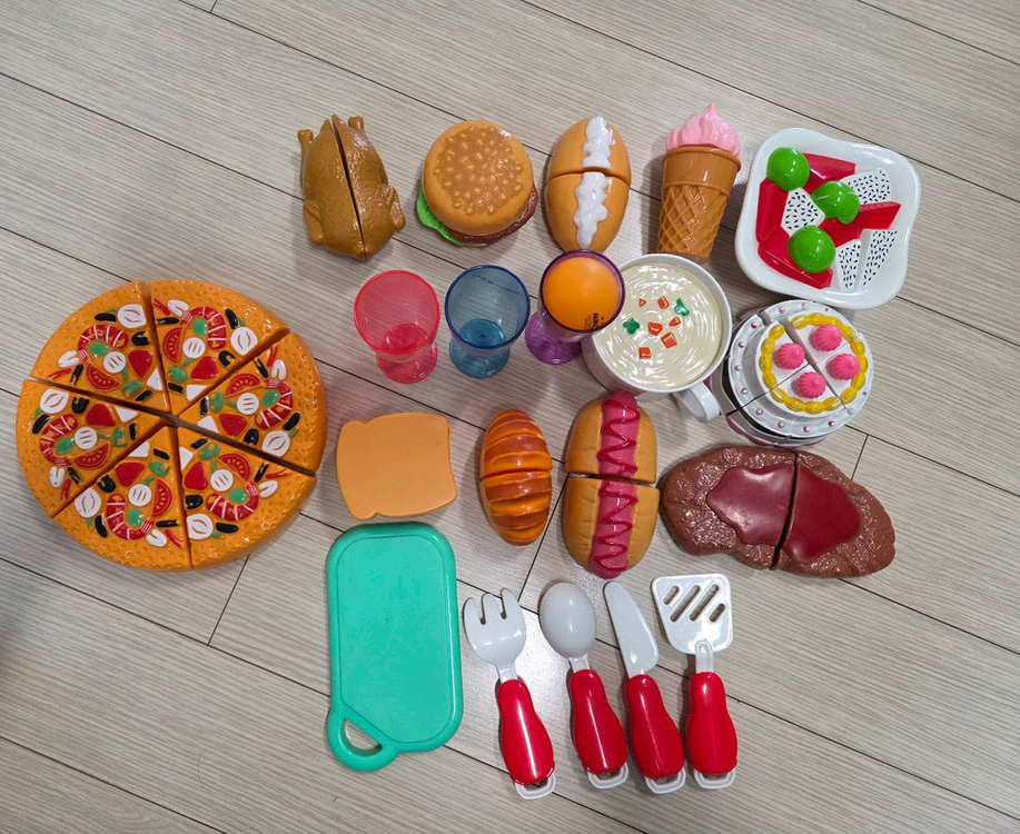아이들이 좋아하는 베이커리 장난감이에요! 케이크 만들기와 다양한 재료들로 구성되어 있어서 역할놀이하기 정말 좋습니다. 사용감은 있지만 상태 양호합니다. 아이가 쥬스잔에 오렌지쥬스 라고 넣었는데 빠지지 않네요ㅠ 예민하신분은 구매 고려해주세요 반품 환불 X