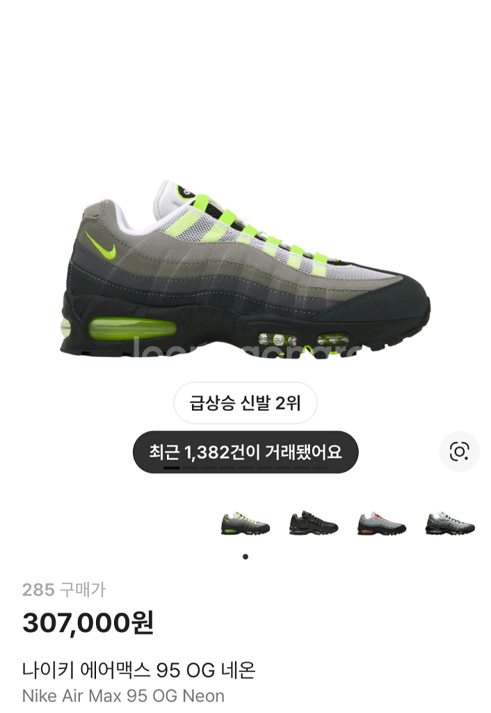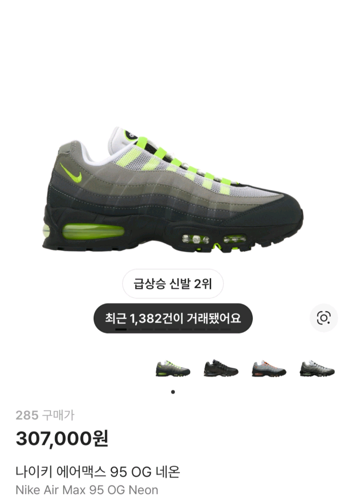 260,285) 나이키 에어맥스 95 OG 네온 판매 260 - 25 265 - ㅍㅇ 270 -ㅍㅇ 275 - ㅍㅇ 280 - ㅍㅇ 285 - 29 서울 직거래 / 택배 4000 *직거래 우선 판매 미시착 미개봉 판매 합니다 나코택 매장 직접 구매 정품 - 2026년 판매 제품 네고 x