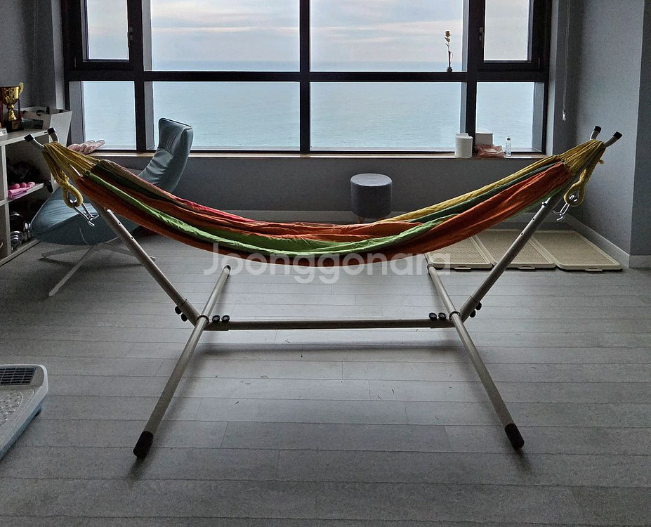 Boho 대형 해먹스탠드(베이지색) 1번 사용하고 보관중이라 상태 매우 매우 좋습니다. 신품급입니다. 1. 해먹 길이 조절 가능 (소형.중형.대형 다 가능) 2. 설치시 스탠드 가로 총길이 268cm 3. 다리쪽 아치형 설계로 안정성 좋습니다. 4. 너트 고정 방식으로 손으로 돌려서 설치.분해 쉽습니다. 5. 타제품과 차이점 : 다리부위 연결부위 너트가 각각 2칸이라 견고하게 고정됩니다. 타 제품은 1칸..입니다. 레인보우 해먹 대형 같이 드립니다.~ 나무에 연결하는 웨빙포함입니다.
