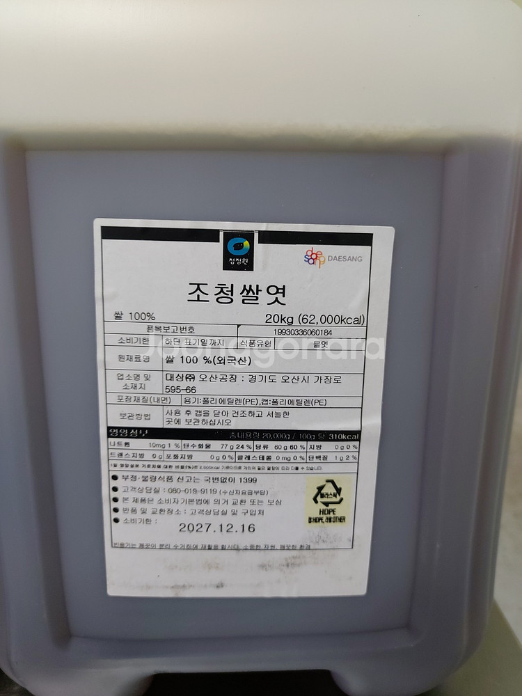 청정원 조청쌀엿 20kg 판매합니다. 유통기한 2027년12월16일이후 원재료 쌀100%(외국산)