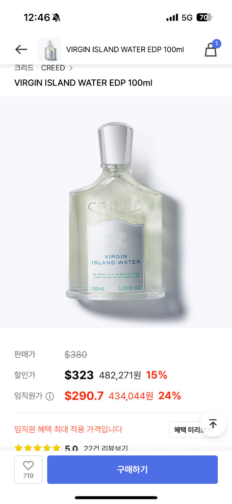 크리드 버진아일랜드 100ml 면세에서 친구부탁으로 샀는데 선물받았다고 해서 처리합니다! 면세점밀폐봉투 그대로 개봉도안한 정품입니다. 원하시면 구매내역 공유드립니다. (택배비포함) 수