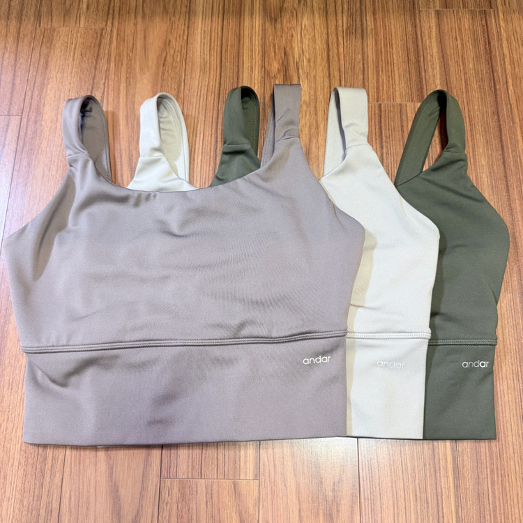 클레이브라운 / 그레인베이지 / 더플그린 작년12월 갤러리아 안다르 매장구입 안다르 브라탑 크롭탑 좋아해서 라인별 색깔별로 엄청 많이 사는바람에 일부 정리합니다 더플그린만 세탁후 미사용/ 나머지는 5회미만 착용 브라패드x 일괄가격이고 개별판매 안해요 네고반품환불❌