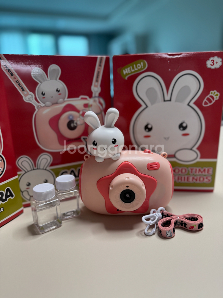토이즈데이 핑크토끼 자동 버블 카메라입니다 LED 불빛이 장착되어 있어 야간에도 색다른 재미의 비눗방울 놀이를 즐길 수 있어요 간편한 버블액 설치로 쉽게 사용 가능합니다 비눗방울액 2개와 끈 1개가 포함되어 있습니다 건전지는 미포함입니다 세개모두 새상품 이며 사진촬영하려고 한개만 언박싱 살짝 한거에요 개당 7000원 입니다 일괄로 구매시 20000원 입니다 반택으로 보내드려요 +2000 직거래도(문고리) 가능합니다