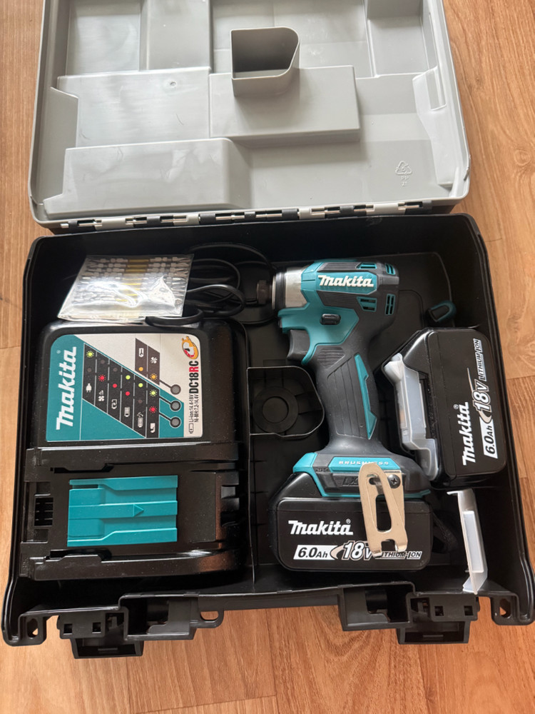 충전식 임팩트 드릴과 배터리 2개가 포함된 완전한 세트입니다. 케이스와 액세서리까지 모두 구성되어 있어 바로 사용 가능해요. 상태 양호하고 실용적인 작업용 공구입니다. 실사용 1일 상태 좋습니다.