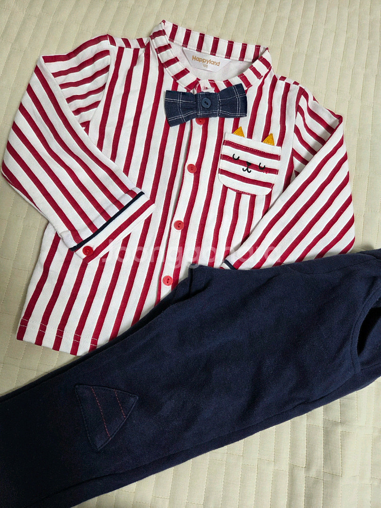 Happyland 유아 상하복 세트 100사이즈입니다 실제로 입히면 더 예쁘고 귀여워요^^ 빨간색과 흰색 스트라이프 셔츠에 네이비 색상의 바지입니다 - 사이즈는 100(24M)이며 18~24개월 아기에게 적합합니다 셔츠에는 귀여운 턱시도 디자인과 포켓이 있습니다 몇번 안입어 상태좋습니다! 기념일이나 사진찍는날입으면 좋아요^^