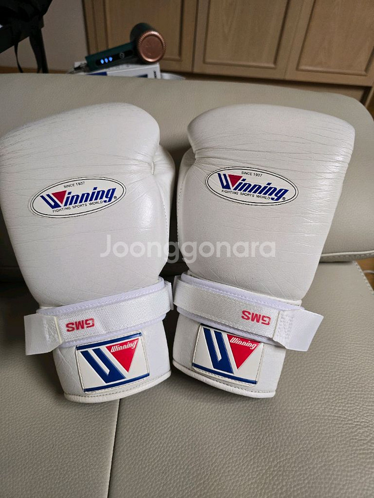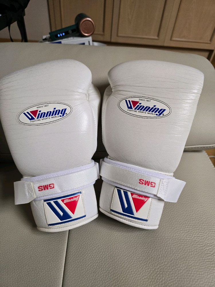 위닝 복싱글러브 화이트 레이스 제품입니다. 14온스이고 끈은 위닝 정품 f-24끈으로 교체했습니다. 컨버터는 사용안한 새제품입니다. 폼은 아직 살아있고 수명도 많이 남았으나 까짐,이염등 사용감이 있어서 싸게 판매합니다