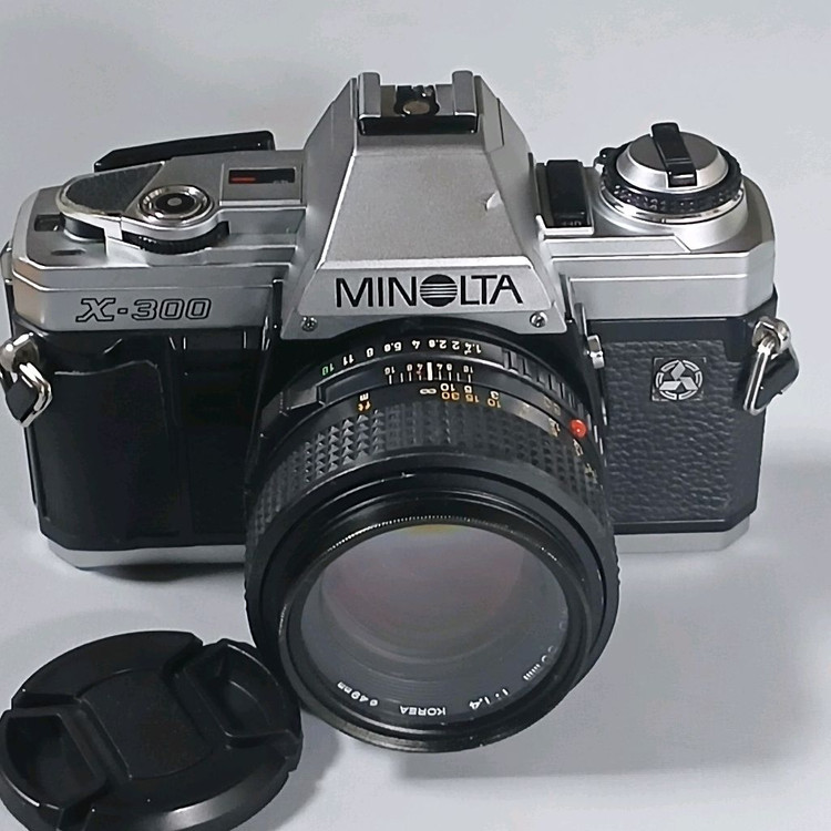 미놀타필름카메라와 렌즈X300 MD50.4mm Lens가 함께 있는 세트입니다. 외관 상태 양호하고 렌즈캡도 포함되어 있어요. 필름 사진 입문용으로 좋은 카메라예요. 상태좋습니다