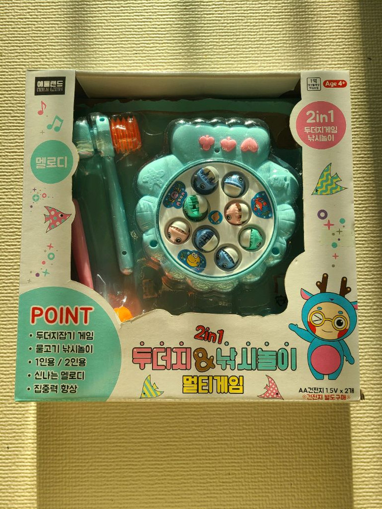 개인정보(거래정보)를 주고받는 행위는 사기에 노출될 수 있으므로 즉시 중고나라로 신고해 주세요애들랜드 멜로디 두더지 & 낚시 놀이 멀티 게임입니다 2in1 두더지 게임과 낚시 놀이를 함께 즐길 수 있어요 멜로디가 나와서 더욱 신나게 놀 수 있습니다 4세 이상 사용 가능합니다 오늘 받았는데 새제품 뜯어만 봤습니다