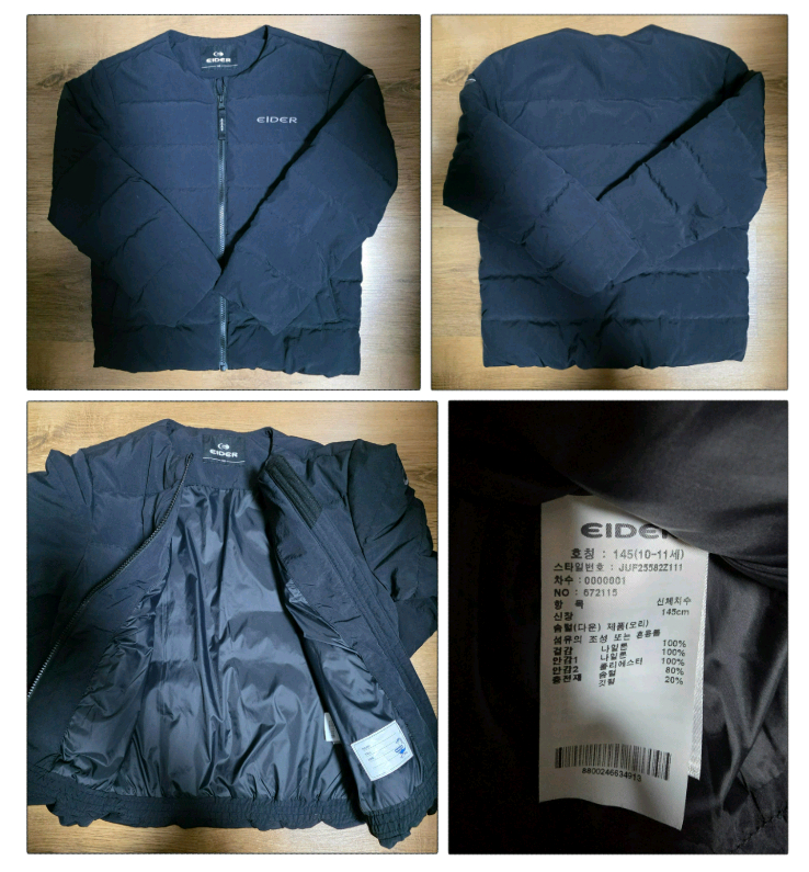 아이더 키즈 경량 패딩 점퍼 145 판매합니다 작년 12월에 구매 했어요~ 한번 입었습니다. 오염 얼룩 없습니다. 상태 양호해요~ ㅡㅡㅡㅡㅡ ▣ 브랜드 : 아이더 ▣ 모델명 : JUF25582Z111 ▣ 색상 : 블랙 ▣ 사이즈 : 145 ▣ 총길이 : 53cm ▣ 소매길이 : 43cm ▣ 색상 : 블랙 ▣ 소재 : 겉감,안감1 나일론 100% 안감2 폴리에스터 100% ▣ 충전재 : 거위 깃털 20%, 거위 솜털 80% ㅡㅡㅡㅡㅡ 아이더 키즈 경량 패딩 점퍼 블랙 [145]4반값o ㅡㅡㅡㅡ ♧구매문의 ~ 답장 늦더라도 꼭 드립니다 ㅡㅡㅡㅡㅡ ♧일반택배 : 4000 ~ 5Kg미만 [박스포함/도서제외] ㅡㅡㅡㅡㅡ ♧반값[알뜰] : 2000 - CU접수 - 1Kg 미만[박스포함] - 의류,잡화만 가능 - 박스세변합 1m이하 ㅡㅡㅡㅡㅡ ♧ 배송관련 ~ 당일 택배 접수후 다음날 발송 됩니다. ~ 접수 다음날 택배 방문 발송후 송장번호 나오면 메세지 바로 드립니다. ~ 꼼꼼하게 포장해서 발송드립니다. ~ 합배송 불가능합니다. ㅡㅡㅡㅡㅡ ~ 제 판매 이력 보시고 믿고 구매하셔도 됩니다. ~ 개인사유로 반품, 환불 안되요 ㅠㅠ ~ 신중히 생각하고 구매 부탁드립니다. ㅡㅡㅡㅡㅡ 아이더 키즈 경량 패딩 점퍼 블랙 [145]