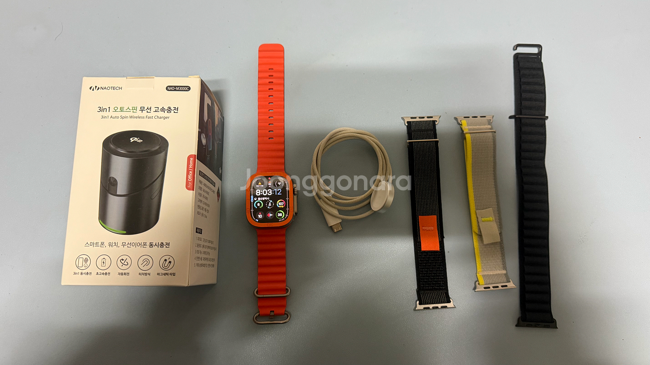 애플워치 울트라2,배터리95프로,셀룰러,내츄럴티타늄 애플워치 울트라2ㅡ상태A급 모든기능 정상 상태 ㅡA급 배터리ㅡ95프로 박스는 없음 정품밴드,정품 케이블포함 앞면 풀커버 케이스 액정 어제 붙임 미사용 비정품 밴드2개 ,사용한 밴드1개 포함 아이폰,에어팟,워치 충,전거치대 미사용 포함. 구매원하시면 안전 결재 하시면 됩니다! 궁금한게 있으시면 문의주시면 되구요 그냥.안.사실꺼면서 찔러보기는 하지마세요