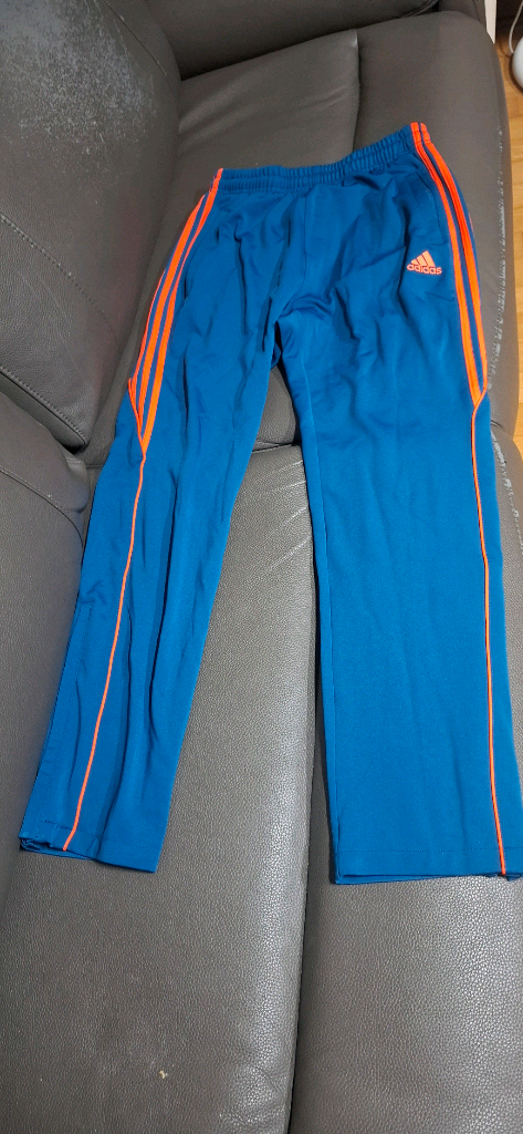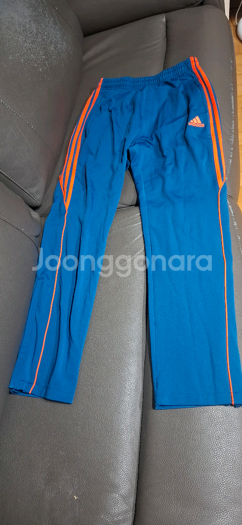 정품 남성용 운동복 바지예요. 블루 컬러에 오렌지 라인이 포인트로 들어가 있고, 사이즈는 105입니다. 키180cm 이상인 분이 입으세요 상태 양호한 제품이에요. 구입가10만원