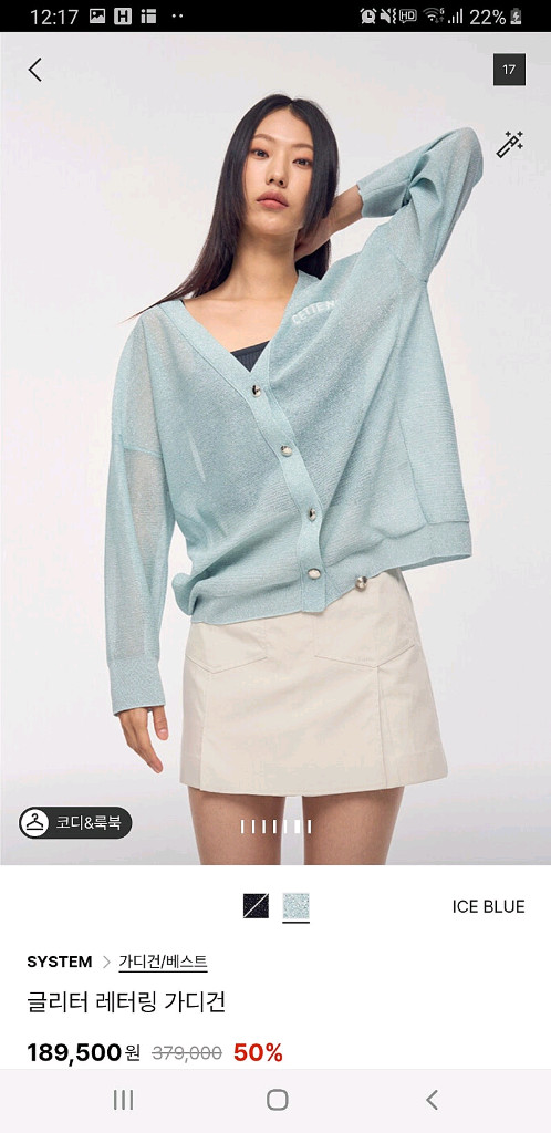 SYSTEM 글리터 레터링 가디건 아이스 블루 색상입니다. 은은한 글리터가 들어가 있어 고급스러워 보입니다. 브이넥 라인으로 여성스러운 느낌을 연출할 수 있습니다. 백화점 메인 제품으로 착용흔적없어서 새상품수준입니다