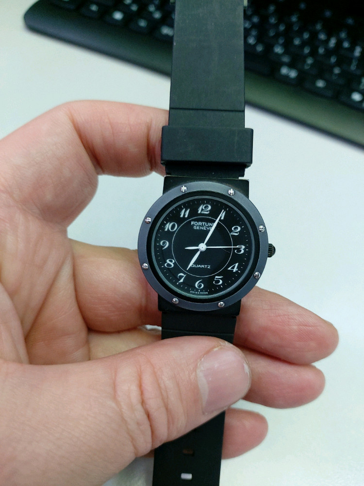 포춘제네바 블랙 쿼츠 남성 시계입니다. 올블랙 색상이라 깔끔하고, 캐주얼한 디자인이 특징입니다. 메탈이 아닌 고무 밴드인 점 참고해주세요. 문의 없으시면 바로 안전결제해주시면 됩니다!