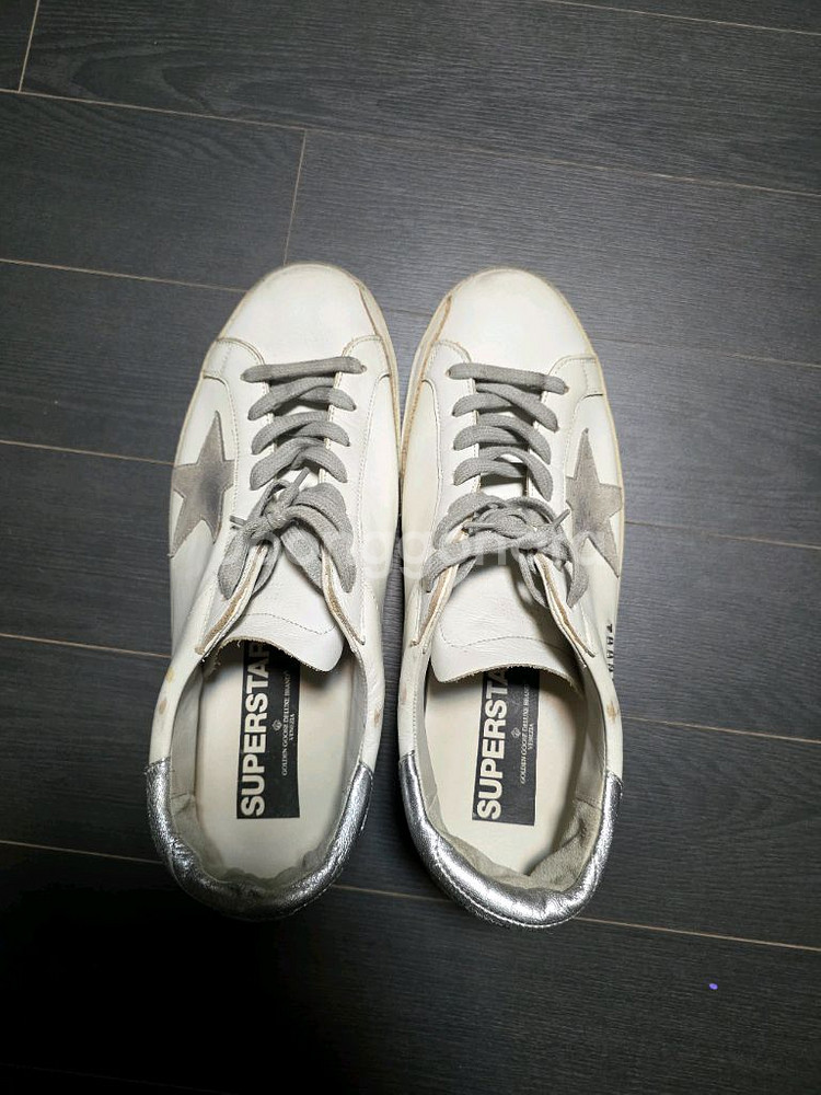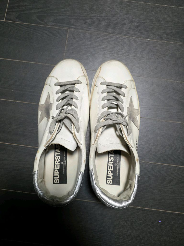 골든구스 슈퍼스타 스니커즈 화이트 실버 44사이즈입니다 44사이즈로 285-290정도 됩니다. 가죽소재로 되어있고 구매후 한두번 신어서 깨끗합니다. 75만원 가까이 했는데 아예 신지 않아서 내놓습니다.