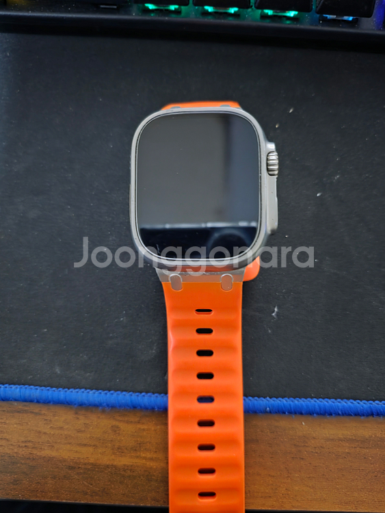 애플워치 울트라2와 오렌지 밴드가 함께 있는 세트예요. 추가 스트랩들도 포함되어 있어서 다양하게 착용 가능합니다. 아주 깔끔하고 기능상 문제없이 잘 작동해요. 직거래 우선입니다 ^^