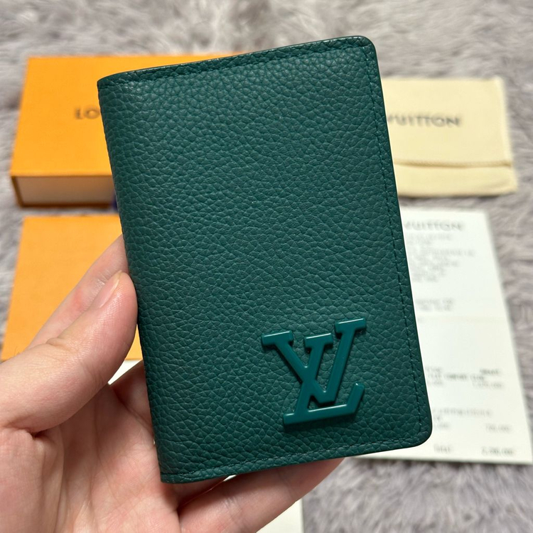 그린 색상의 루이비통 에어로그램 오거나이저 카드지갑입니다. 사진 보시다시피 앞면 루이비통 로고에 까짐 일절 없으며, 모서리 까짐도 없습니다. 내부 상태도 매우 좋습니다. 구성품은 영수증 포함 다 있습니다. 연락주세요.