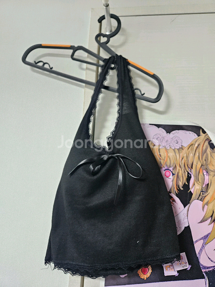 블랙 컬러의 레이스 디테일 홀터넥 나시예요. 목 부분에 리본 장식과 레이스 트리밍이 있어서 로맨틱한 느낌이 나네요. 상태 양호하고 깔끔하게 관리된 제품입니다.