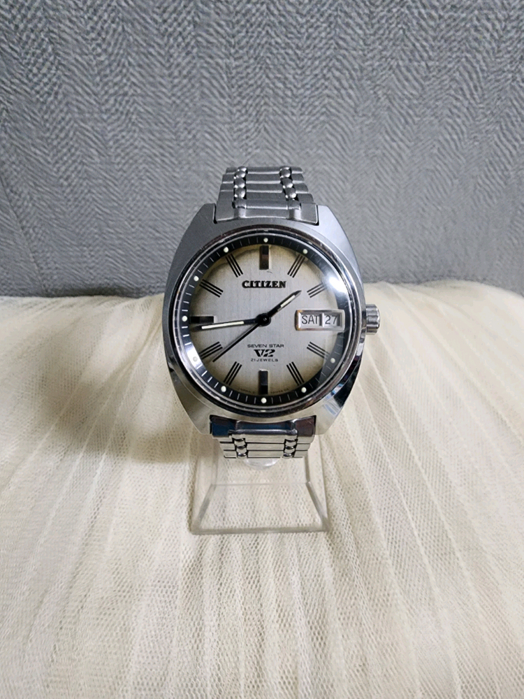 시티즌 세븐스타 V2 빈티지 오토매틱 시계입니다. 대략 70~80년대 제품으로 추정되며, 다이얼 외곽의 은은한 브라운 컬러가 매력적입니다. 21석의 데이데이트 기능의 시계. ☆정상작동 중이며 다이얼을 비롯해 전체적으로 세월감 있습니다. ☆용두 1단으로 날짜 조절만 가능하며, 요일은 용두2단으로 시간조정과 함께 조절해야 합니다. ☆사이즈ㅡㅡㅡ약 35mm 용두제외 구매를 원하시면 안전결제를 이용하여 언제라도 결제하시면 됩니다.