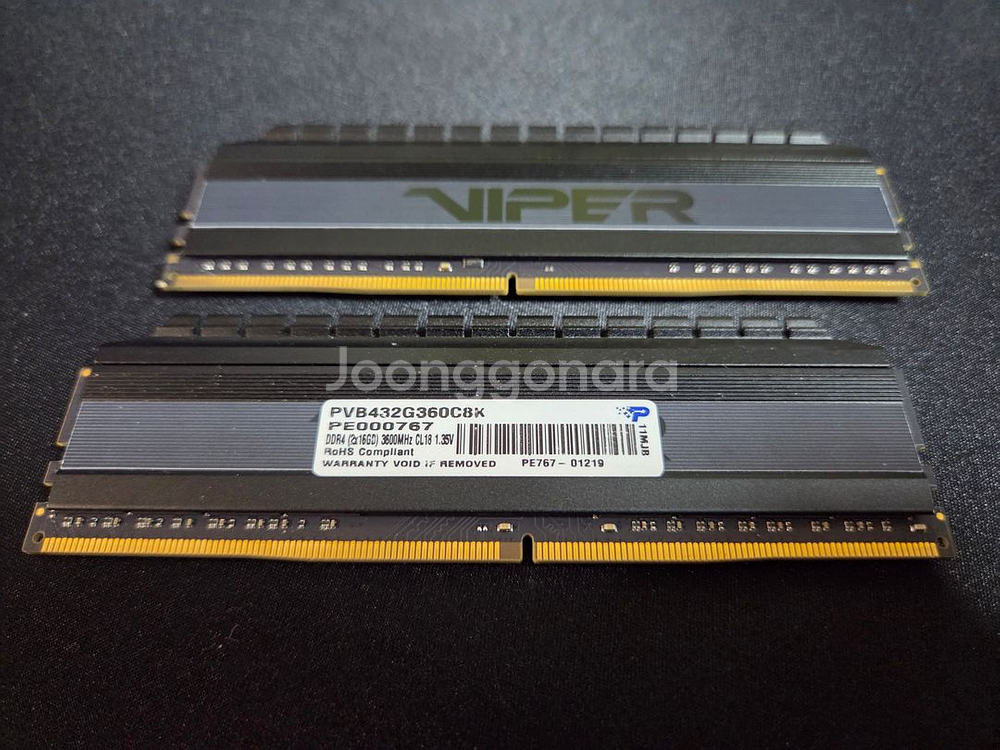 모델명 : PATRIOT VIPER DDR4-3600 CL18 32GB 16G 2개가 한세트이고 두개 일괄로만 판매합니다. 성능 이상없고, 상태 양호합니다. ■ 직거래 : 경기 일산 ■ 택배거래 (안심결제 가능) : 결제 후 당일 편의점 택배 발송 -.택배거래 요청시 파손면책에 동의하는 것으로 간주