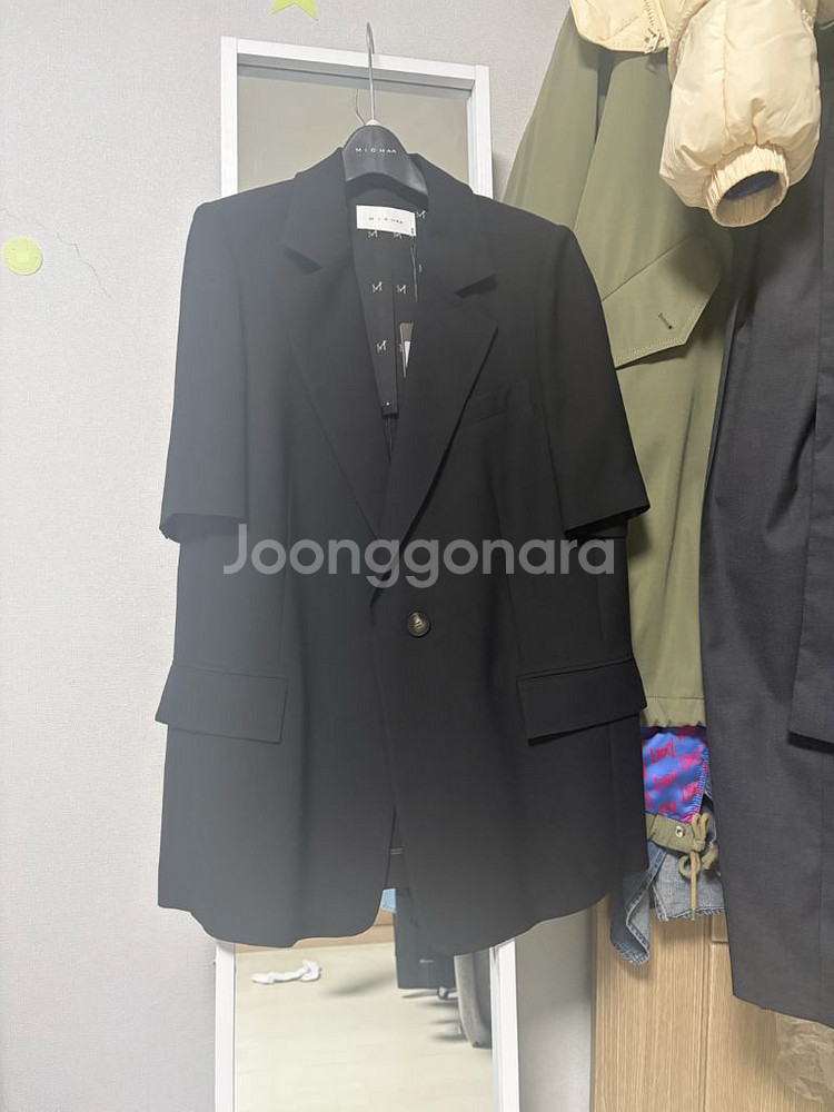 블랙 반팔 자켓이에요. 깔끔한 디자인으로 다양하게 활용하기 좋고, 상태도 양호합니다.새상품