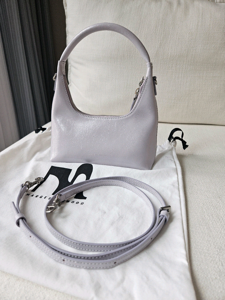 코스모폴리탄줄라이님이 착용하신거 보고 구매한 제품. 착용샷 제품보단 연한 라벤더 같습니다. 마지셔우드 미니 호보백 라벤더 새상품. 크로스 가능한 끈 포함. 구매후 들고 나가질 않고 보관만하게되서 판매합니다. 구매가24만원대였습니다.